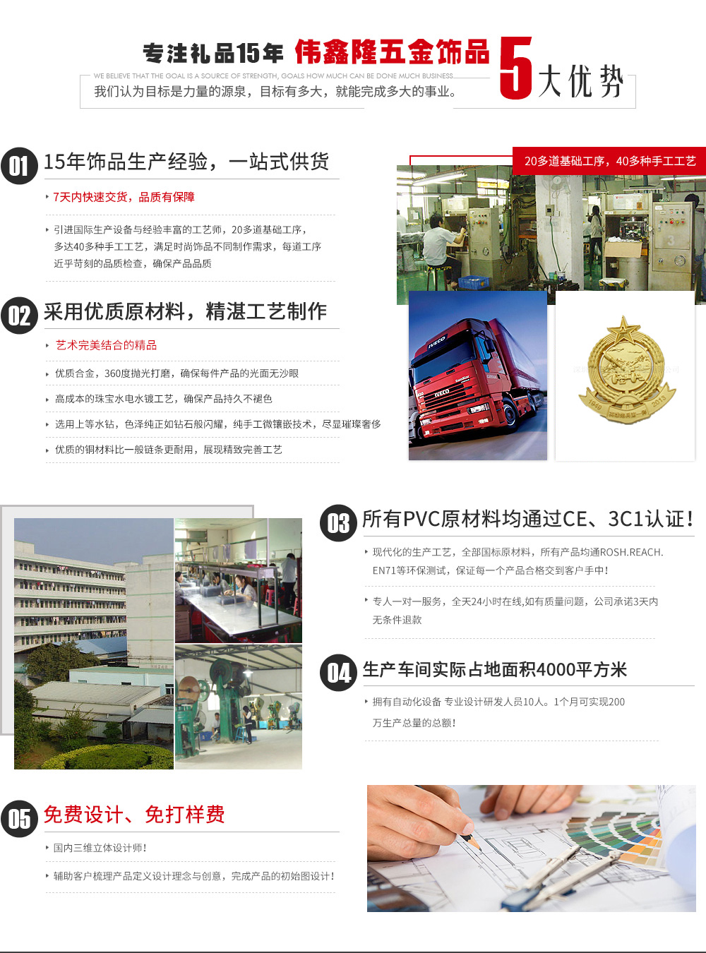 深圳市偉鑫隆五金飾品有限公司位于廣東省深圳市坑梓鎮(zhèn),是一家集設(shè)計、生產(chǎn)、銷售為一體的專業(yè)五金禮品工藝公司。 公司擁有經(jīng)驗豐富的專業(yè)技術(shù)精英團隊,至今已有十多年設(shè)計生產(chǎn)經(jīng)驗。 公司自有工廠引進先進的臺灣設(shè)備及技術(shù),擁有設(shè)計、繪圖、制模、沖壓、壓鑄、拋光、電鍍、包裝等生產(chǎn)流程,可生產(chǎn)銅、鐵、不銹鋼、鋁、鋅合金、鉛錫合金等材質(zhì)的金屬徽章、胸針、胸章、獎?wù)?、獎牌、金屬?biāo)牌、工號牌、金屬鑰匙扣、狗牌、軍牌、開瓶器、金屬手機吊飾、錢夾、領(lǐng)帶夾、帽夾、項鏈吊墜、掛包鉤、紀(jì)念章、紀(jì)念幣、袖扣、促銷禮品鑰匙扣、書簽、五金配件、開瓶器等旅游紀(jì)念品及工藝禮品五金飾品。我公司還可根據(jù)客戶樣板開模生產(chǎn)。 公司秉承“精...